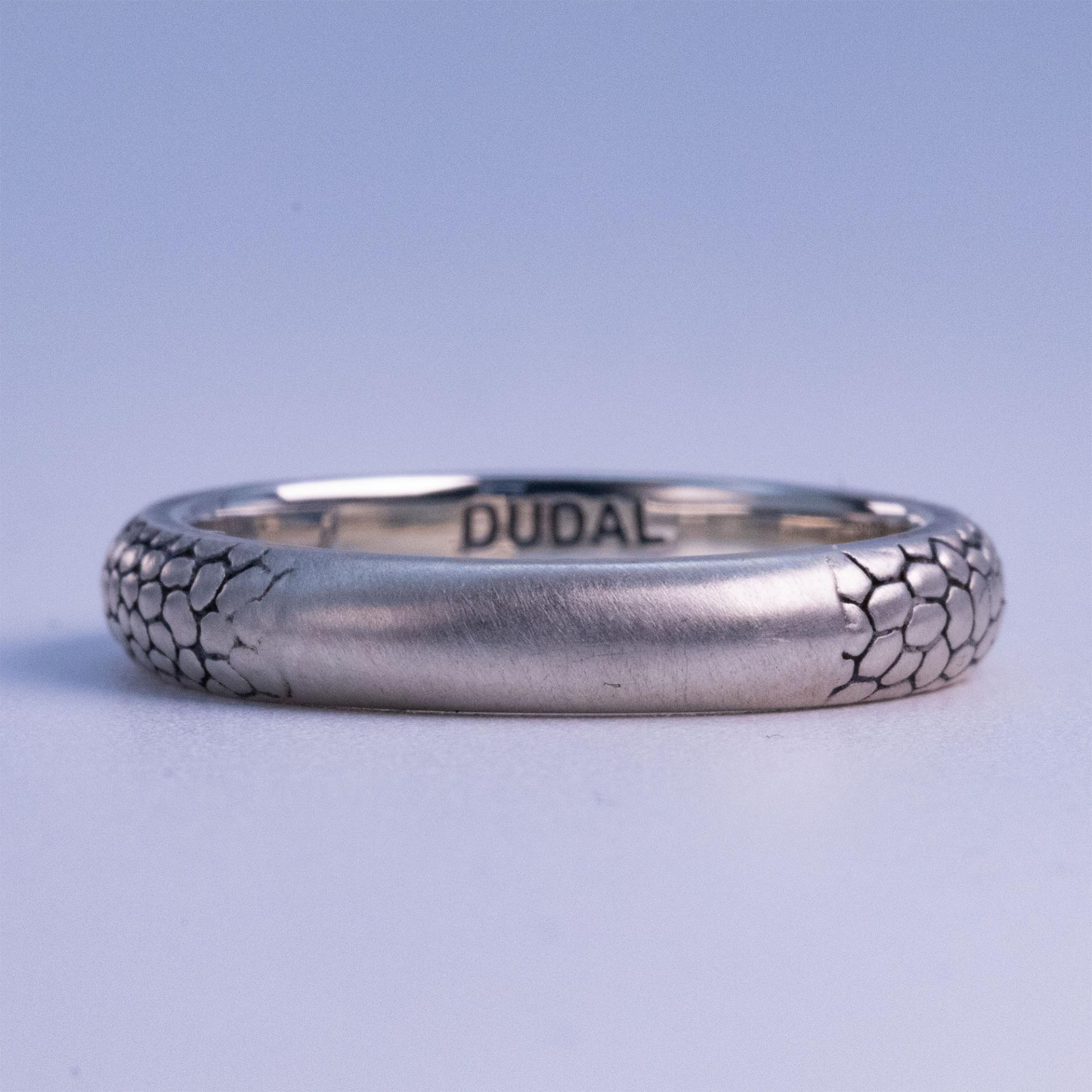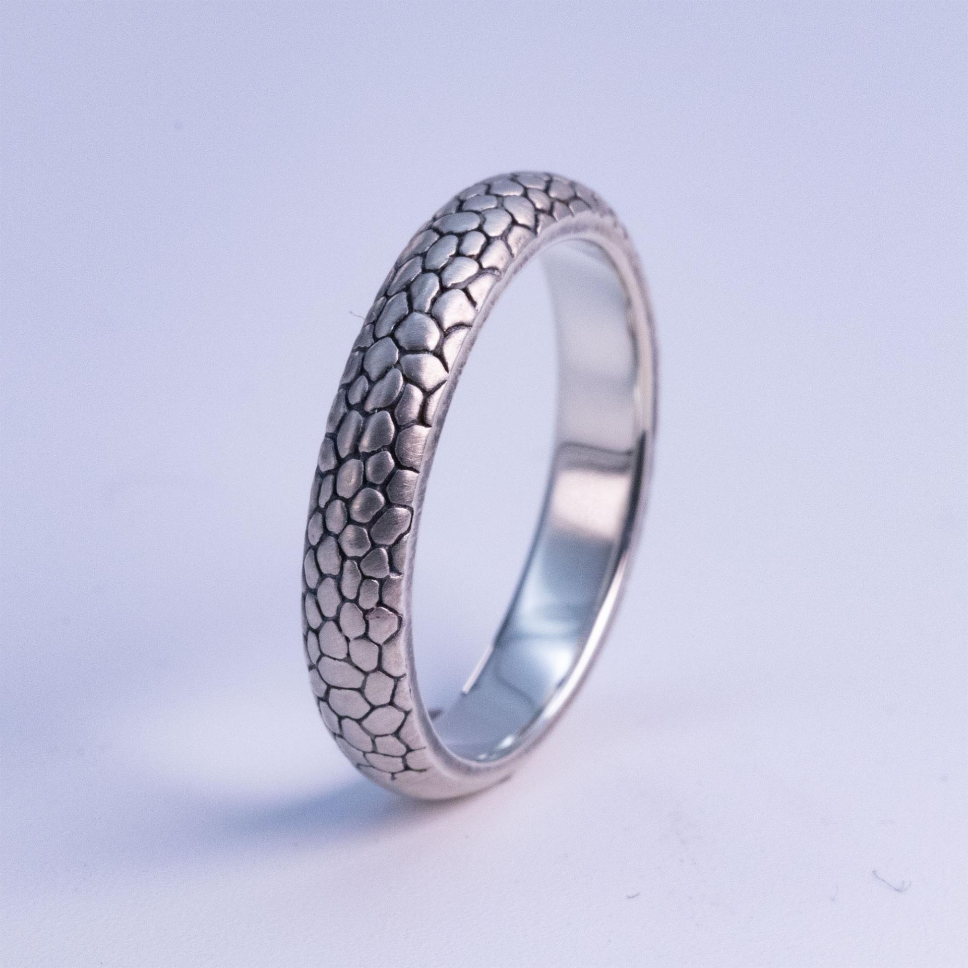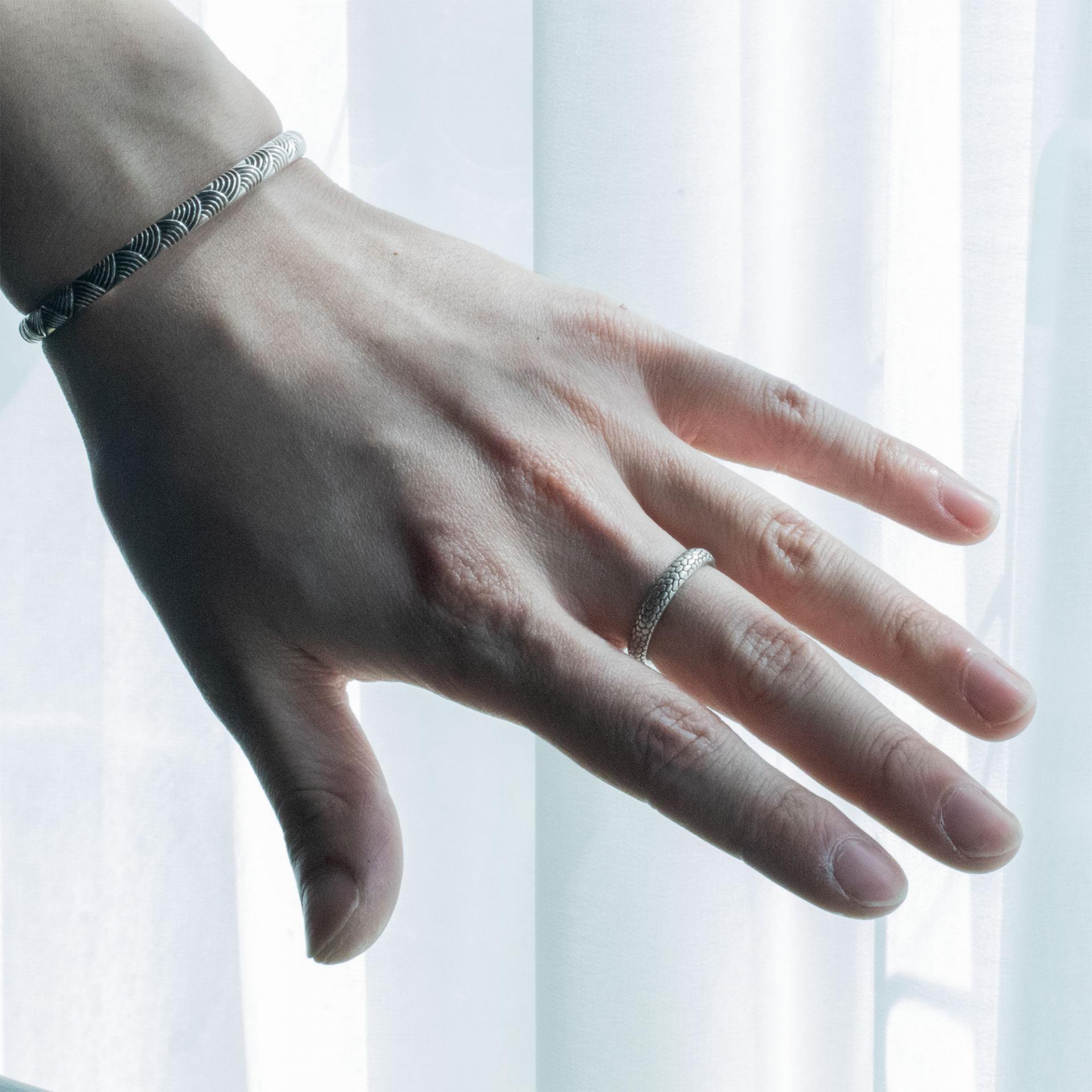 자연 속 패턴들은 그 크기와 맥락에 따라 다양한 형태로 보입니다. 이 반지는 문어의 피부 질감을 참고하여 제작되었지만, 바라보는 시각에 따라 뱀의 비늘, 메마른 땅의 갈라짐, 혹은 바닷속 암석의 표면처럼도 보일 수 있습니다. 이러한 다층적인 해석이 가능한 점이 이 패턴의 가장 큰 매력입니다.