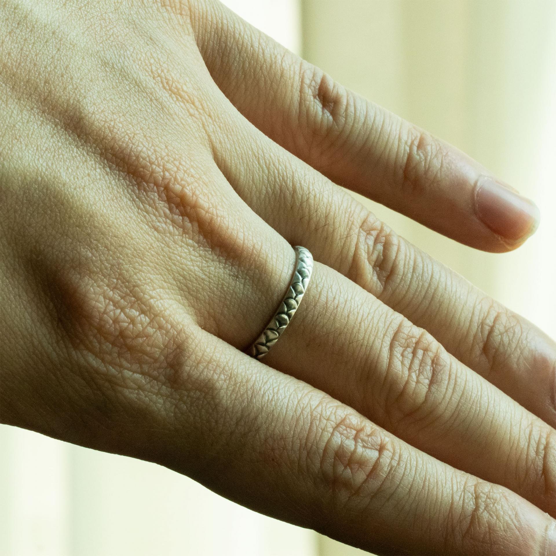 기존의 비늘 반지 시리즈와 동일한 패턴을 공유하면서도, 더욱 슬림한 형태로 제작되어 손가락 위에 섬세하게 스며들 듯 착용됩니다.