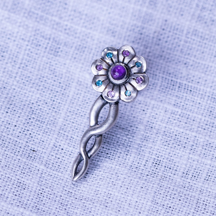 중앙에는 깊은 보랏빛의 자수정이 세팅되어 있으며, 런던블루 토파즈와 작은 자수정이 사이드에 배치되어 신비롭고 조화로운 느낌을 더합니다. 자수정은 지혜와 평온함을, 런던블루 토파즈는 차분한 안정감을 상징하여 착용자에게 내면의 균형과 긍정적인 에너지를 전달합니다.